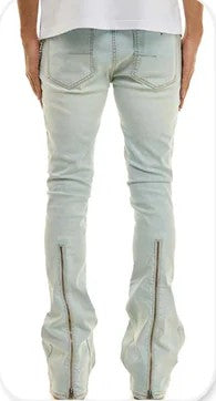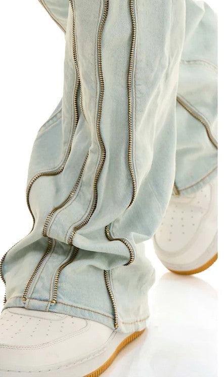 Turn heads with these statement skinny flare jeans, designed for a bold streetwear edge. Crafted from premium light-wash denim, this pair features multiple exposed zippers running along the legs for a standout, fashion-forward look. The skinny fit through the thigh transitions into a subtle flare at the hem, giving you a modern silhouette that stacks perfectly over sneakers or boots.