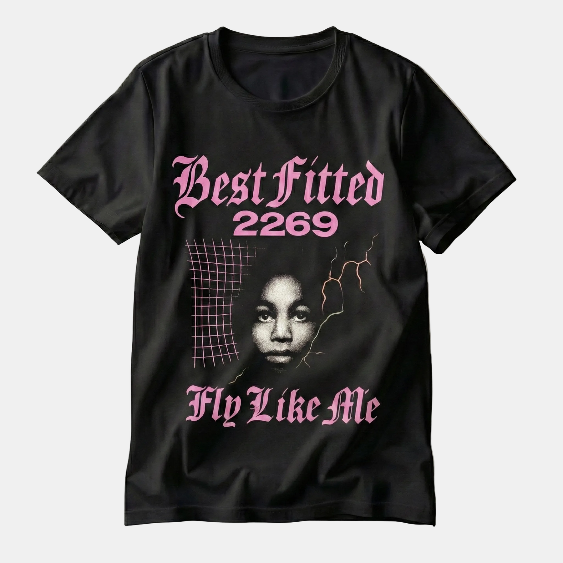 The centerpiece of this black tee is a high-contrast monochromatic portrait, framed by a distorted retro grid and striking lightning accents. The look is anchored by the signature "Best Fitted" branding and "Fly Like Me" slogan in a distinctive pink Gothic Old English font. Whether you are layering it for a night out or keeping it casual, this tee delivers an unmatched attitude.