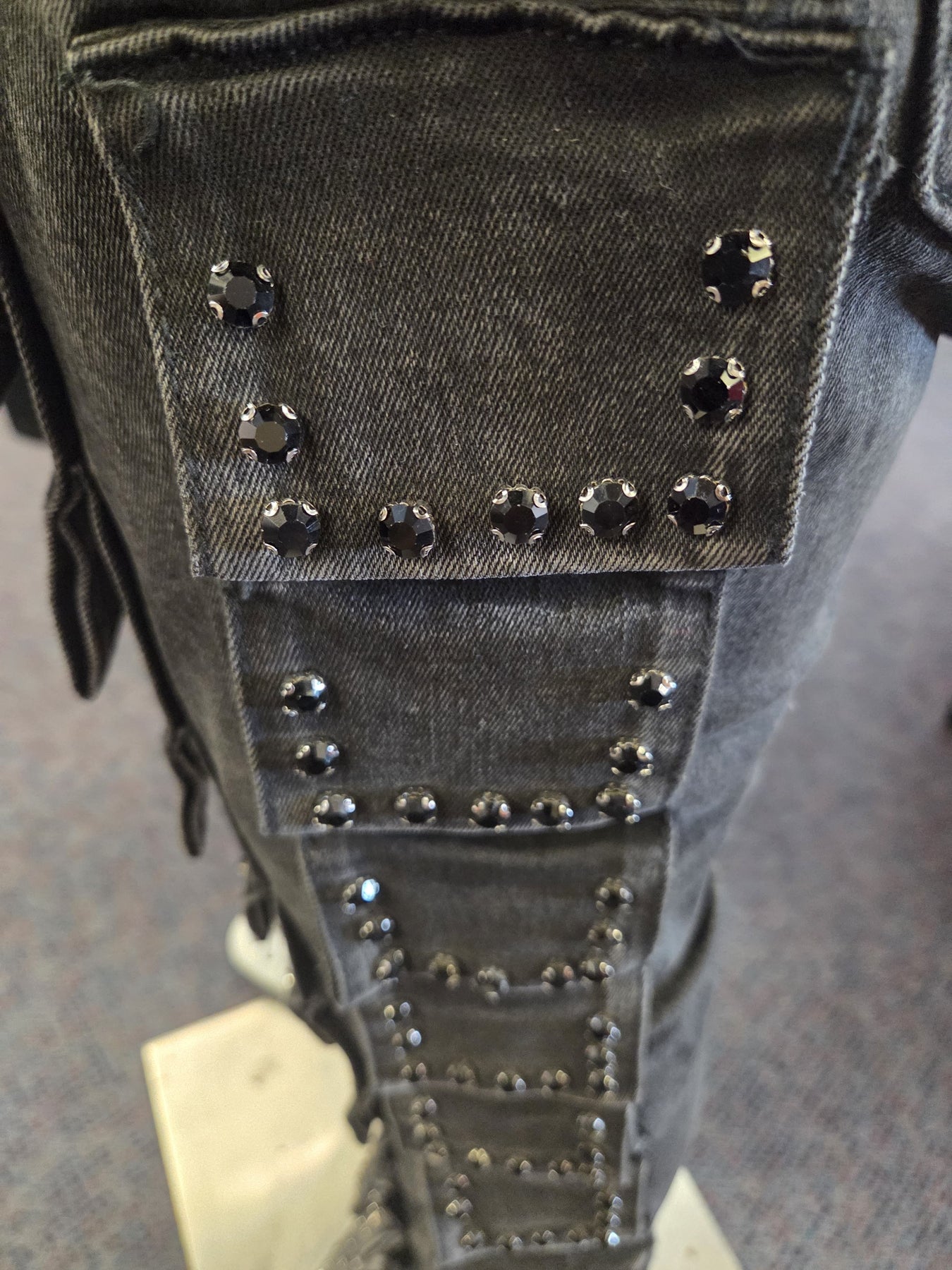 • Overall Aesthetic: The combination of the dark wash, metal studs, and aggressive layering gives the jeans a very bold, edgy, and high-texture look. They are clearly a statement piece.