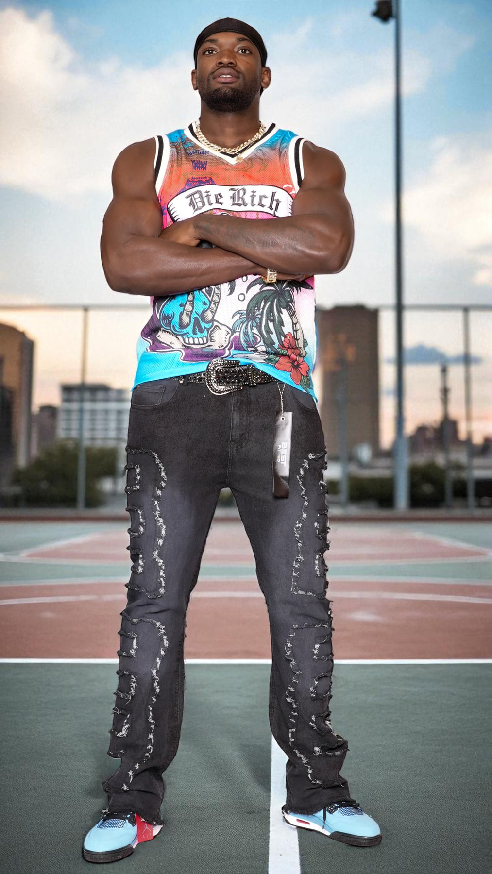 These jet-black skinny-fit jeans, crafted from high-quality stretch denim, feature heavy distressing with large, intentional rips from thigh to ankle, accented by white fringe threading for a bold, tribal edge. As premium stacked denim jeans, they combine luxury design, street-style fashion, and perfect comfort, offering a slim silhouette that sits low on the waist, paired with a wide silver concho belt. Perfect for urban streetwear, they’re designed to showcase your sneakers with a cropped hem. Ideal for a gritty, high-fashion look.