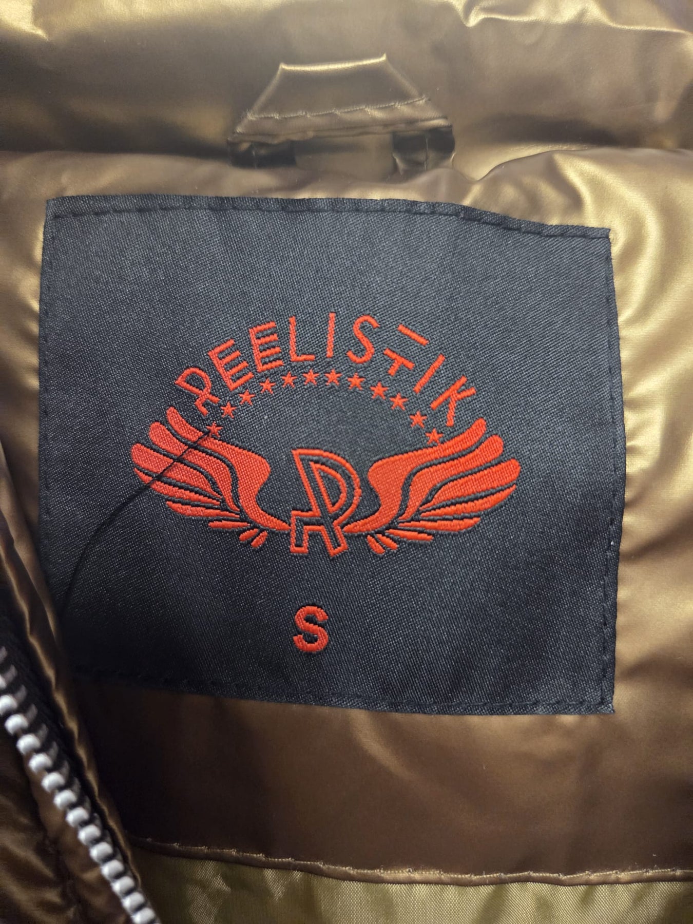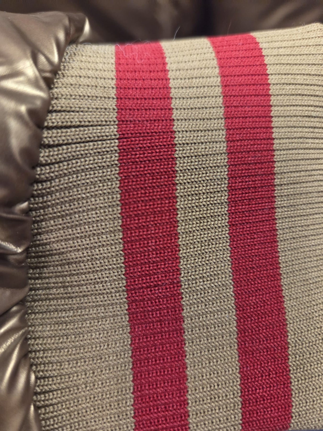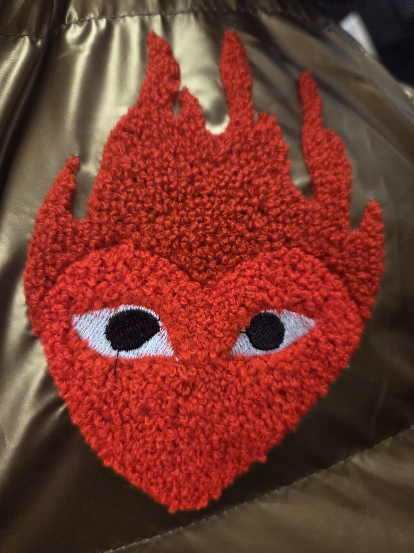 Red and beige striped ribbed cuffs and hem provide a snug fit and a sporty touch, while the standout red flame patch on the chest adds a playful, edgy element. With its zip-up front and high-shine exterior, this jacket is perfect for cold-weather streetwear with attitude.