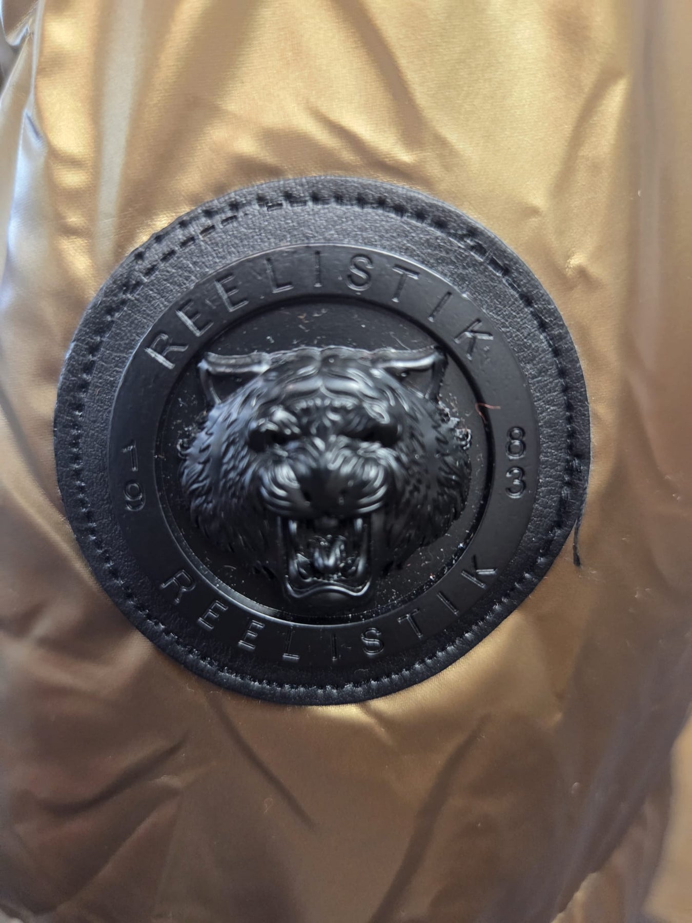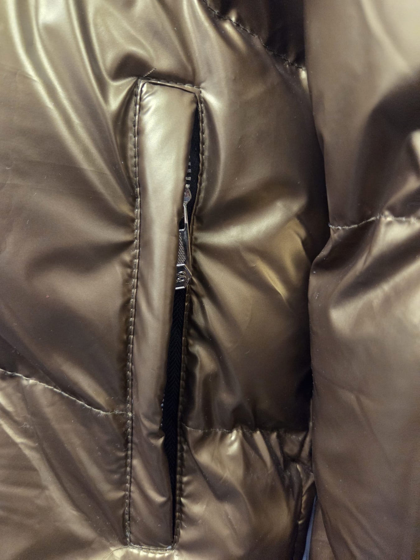 Make a bold statement with this eye-catching metallic gold puffer jacket. Designed for both warmth and style, it features a glossy finish that reflects light with every move. The jacket is equipped with a cozy, oversized hood lined with luxe black faux fur for added insulation and flair.